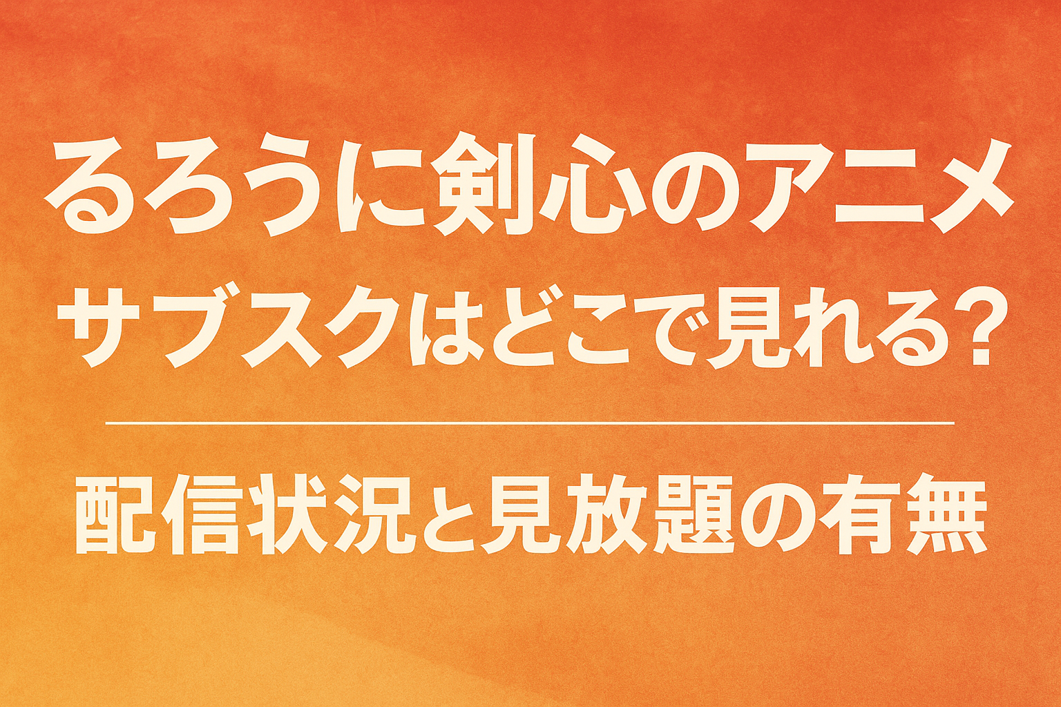 2025年10月8日現在、TVアニメ『るろうに剣心-明治剣客浪漫譚-』(新アニメ版)は、Amazonプライム・ビデオをはじめ、ABEMA/dアニメストア/DMM TV/FOD/Hulu/Lemino/U-NEXT/Netflix/TELASA/アニメタイムズ/J:COM STREAM 見放題/milplus見放題パックプライム/バンダイチャンネル/ニコニコチャンネルなどで配信されています。更新曜日・時刻は公式の「放送情報」で案内され、サービスごとに異なります。※配信や更新の時間は予告なく変わることがあります。
